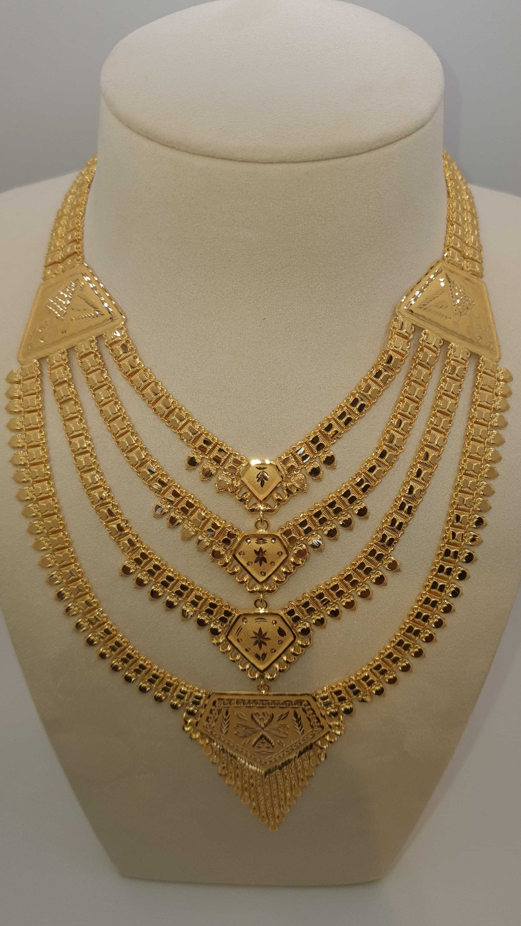 Product Description: • Made with genuine 21K yellow gold – by Motiwala Gold Jewellers. • Ensures long-lasting shimmer and a lifetime of auspiciousness. • Suitable for both young and mature women’s. Brand Trust: • Motiwala Gold Jewellers known for exquisite fine jewellery in sophisticated styles. • Years of experience in luxury Pakistani & Indian jewellery. • Offers thousands of styles for men, women, and children Design Inspiration: • Pieces heavily inspired by rich Pakistani, Indian & South Asian culture • Mughal Look and Finish Making It A Statement Piece • Subtle modern influences for everyday wear • Expression of personality in a unique and elegant way • Theme: Awareness, Beauty, Fairytale & Fantasy, Family & Friends, Fashion & Costumes, Flowers & Plants, Inspirational, Luck, Signs & Symbols, Flower, Ring Specification: • Chain Material: 21K Gold • Total Weight: 38.09 gm (Necklace = 32.53 gm, Earrings = 5.56 gm) • Package contains: Necklace & Earrings Set. • It is advisable to store jewellery in a zip lock pouch (air-tight pouch) keep away from water, perfume and other chemicals and clean it with dry and soft cloth. • Image shown is of real product, but Product colour may vary due to photographic lighting sources or your monitor settings.