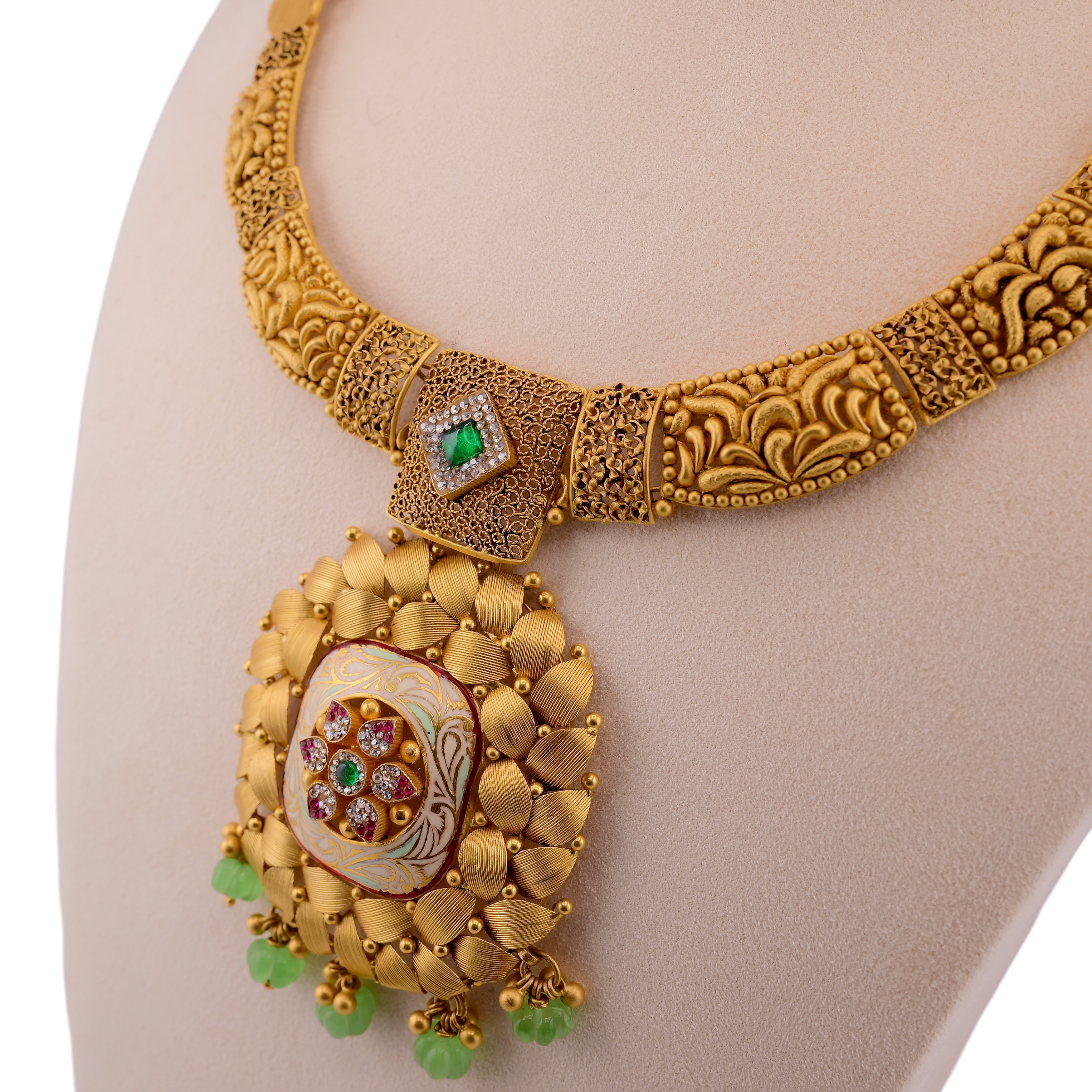 22K Gold Intricate Floral Necklace with Hanging Green Stones
